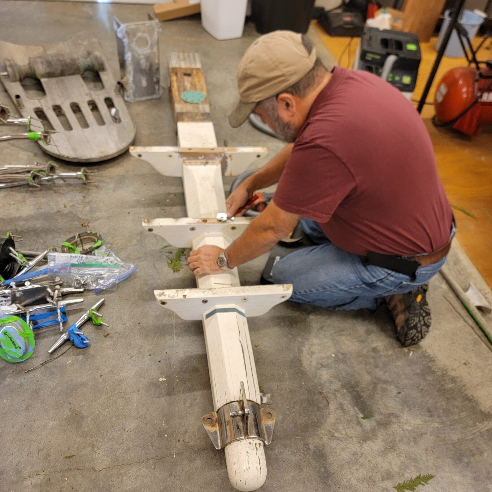 Rob has been working on disassembly of the bowsprit to figure out how to make a new one. Bob Perry didn’t have plans, so he’s reverse engineering. It helps to be pals with a Naval Architecht that we’ve known for decades – Garth came and talked with Rob from an experienced engineering standpoint about the sprit.