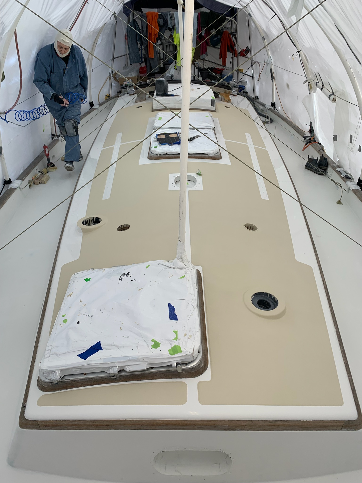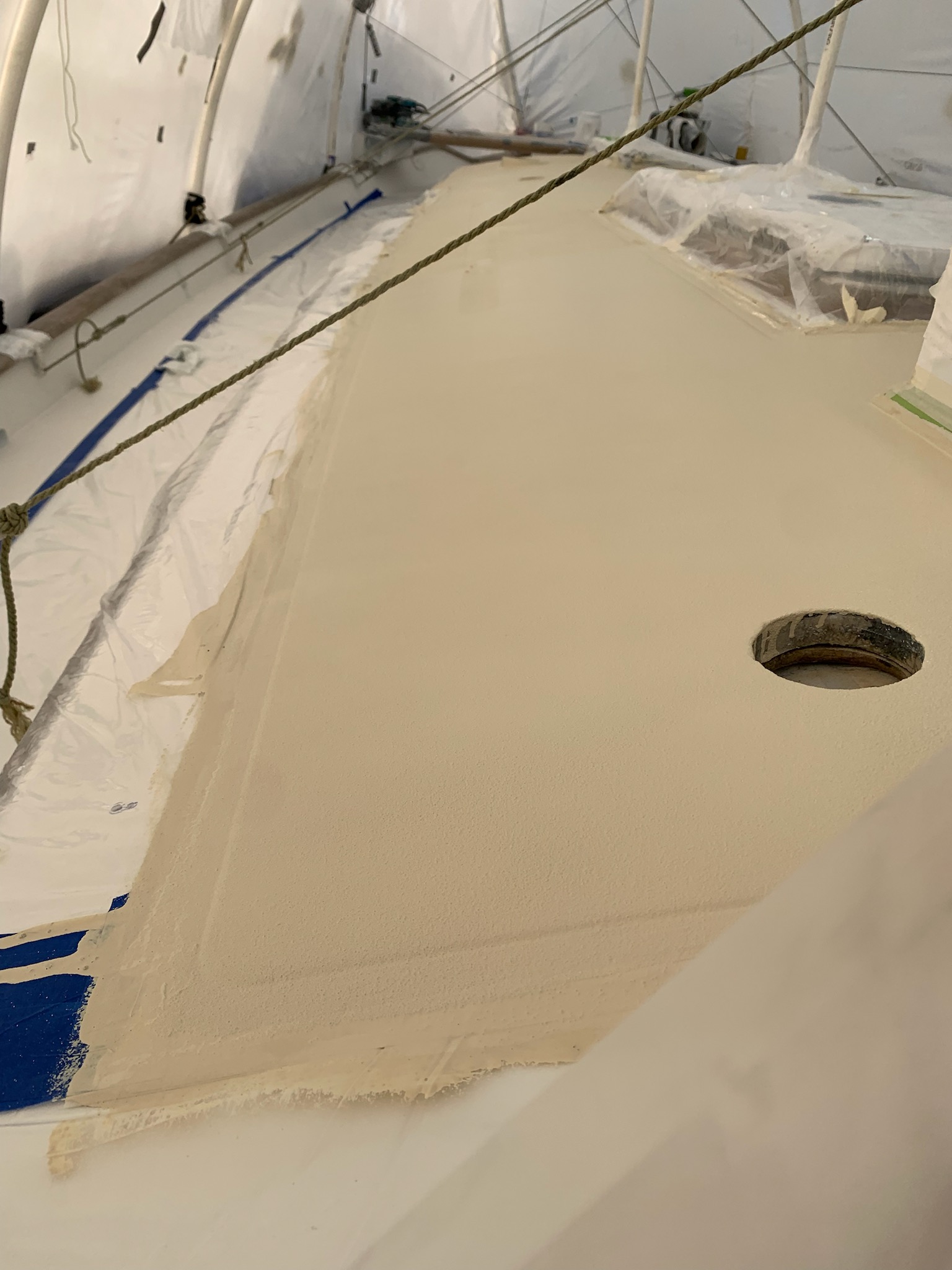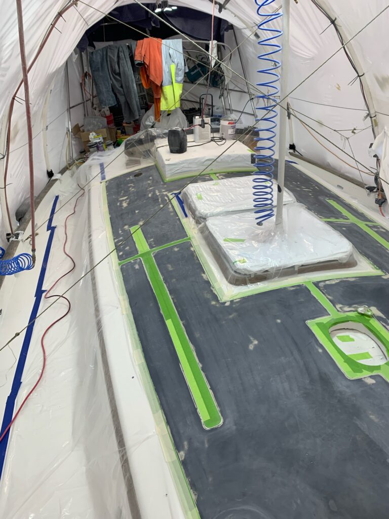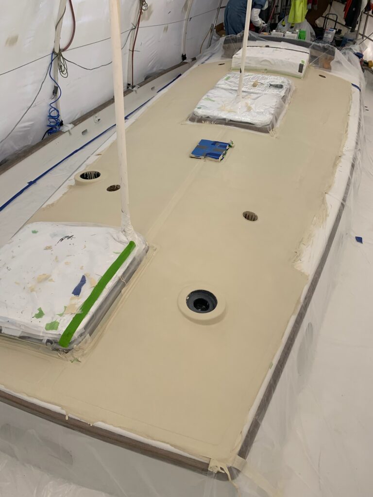 Ethan and Michael are finishing the wet sanding and polishing of the gelcoat. Where on the top deck there were a couple of things to tape around for nonskid, the lower decks are much more complicated. All the deck hardware is dry fit and the area around each piece is taped off so there is no nonskid underneath anything. It’s a labor intensive process, but will be worth the work effort when it’s done.