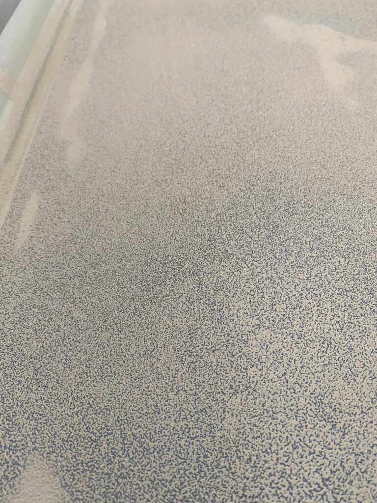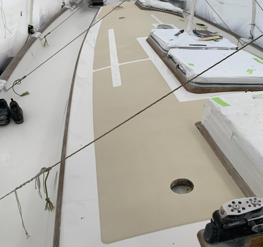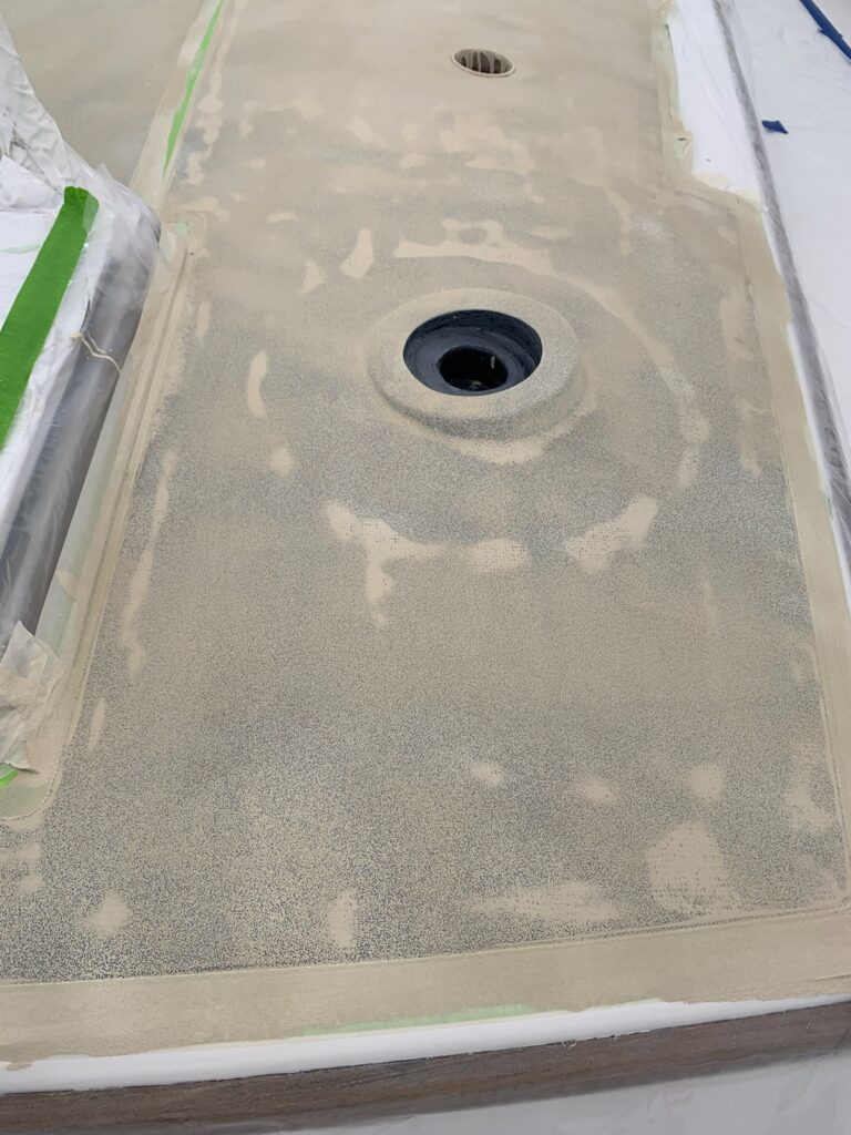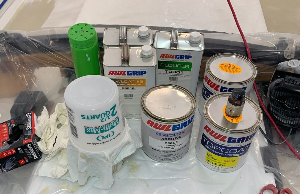 We discussed the options for amount of grit in the nonskid. Awlgrip has three different levels of “grippiness”, we chose mid range “coarse”. We’re not going offshore in heavy seas again, but honestly this gelcoat is so slippery now, we thought a little more than “fine” was necessary. We also chose a color that we were happy with. The colors are custom mixed by Fisheries and part of the ordering process.