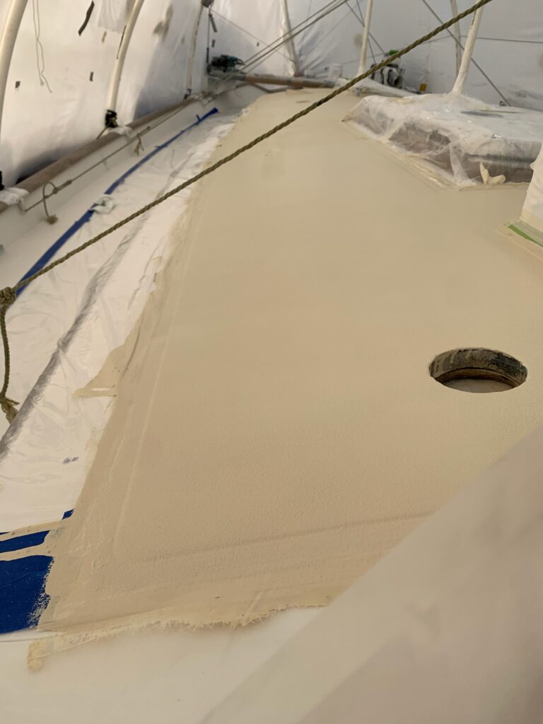 Four coats of Awlgrip go onto the cabin top.
