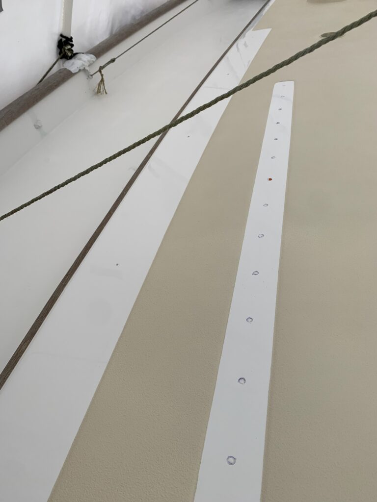 The holes for the staysail jib track and handrail are marked and ready for a newly cleaned up track and brand new handrails.