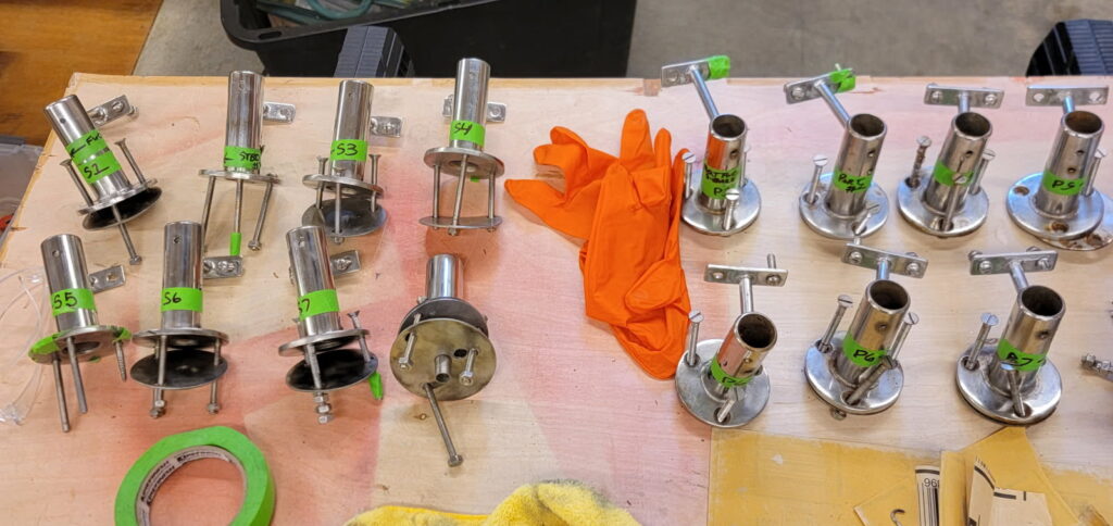 Which is what we have been working on at home in Rob’s woodshop. All the hardware and tracks came home. Of course it was all covered in schmoo (sealant) and required hours of cleanup. A wire wheel takes off the sealant from the bases and bolts, and massive amounts of Flitz metal polish and scrubbing has everything looking shiny and new. It’s all marked with identifying location for reinstallation. Where bolts or screws were missing, a trip to Tacoma Screw got us everything we needed. Some of the hardware was just too ugly to put back on those shiny new decks, so I bought new deck fills for water, sewage and diesel, and also new deck pipes for the chain.