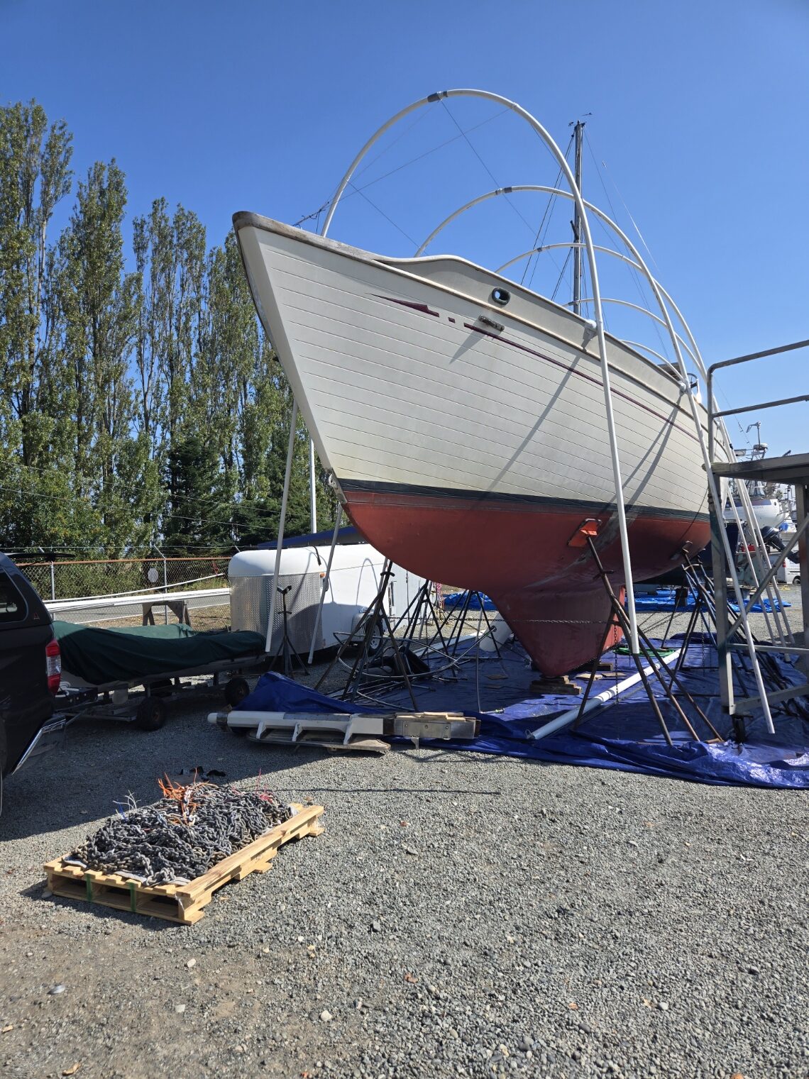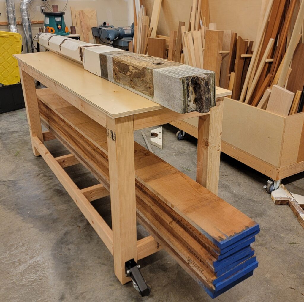 Decided to get the whole thing off the floor and to a more comfortable working height. Built a 6′ workbench for an 8’3″ bowsprit. It’s the same height as my woodworking bench and both are on wheels. Combining the two into a 13′ workbench will come in handy with an 8′ bowsprit, 9′ sapele boards, and a 10′ sled to taper the thickness of the boards with my planer.