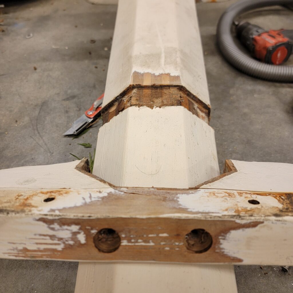 At this point I called my friend, Garth Wilcox, who is a Naval Architect and wood boat builder. He came over and looked at the bowsprit with me. We discussed what was necessary and what wasn’t, what features of the old bowsprit were key designs or random happenstance, and a few things to improve, like wood screw alternatives. A lot of the shapes and tapers used in this bowsprit are purely vanity, not key to strength. On the other hand, I do want to duplicate the original shape, it is important to the look of the boat. But it is nice to focus on minumum dimensions to maintain strength, and realize the shapes are a little more random than they might appear. The back of the bowsprit changes ratios as it tapers forward, the octagonal section is an irregular octogon, and the whole thing starts out wider than it is tall at the samson post, and taller than it is wide at the cranse iron.