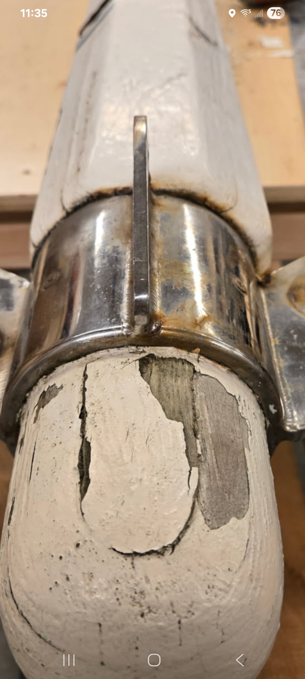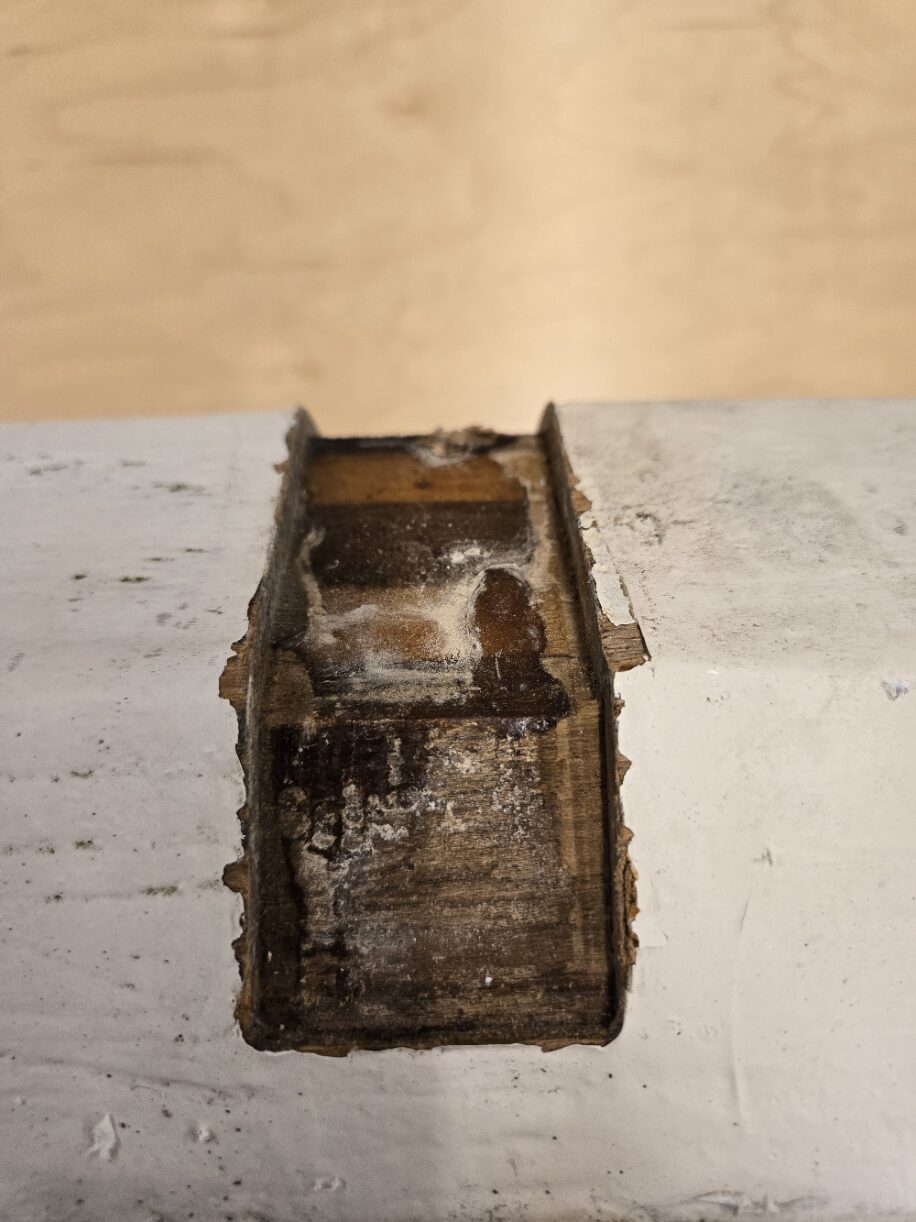 We had to access the wood decking under the bowsprit, so we removed it from the boat. A few things became apperent once it was off. The first was the Samson post is rotting and needs replacement, we’ll address that later. The other is the bowsprit was delaminating. The original bowsprit is laminated teak and holly, which everyone seems to think was a bad idea. In addition to delamination, there were several places where the holly was rotten. Clearly the bowsprit needs replacing, back to my shop it goes.