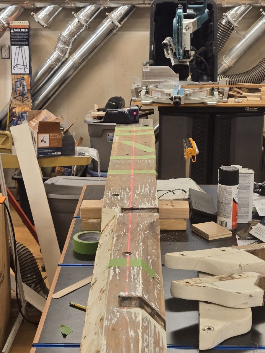 One last prepatory step before I cut wood – define the taper of the SIDES of the bowsprit. To establish a baseline I used a straight line from the middle of the inboard end to the middle of the whisker stay ear on the cranse iron. I then measured both sides. Surprisingly, the measurement to the bottom of the bow sprit was constant over the whole length, the measurement to the top decreased moving forward. So all the taper is cut into the top of the bowsprit. Good news for me because I can accurately cut one side of each board on my cabinet saw, I only have one tapered side to cut with the track saw!