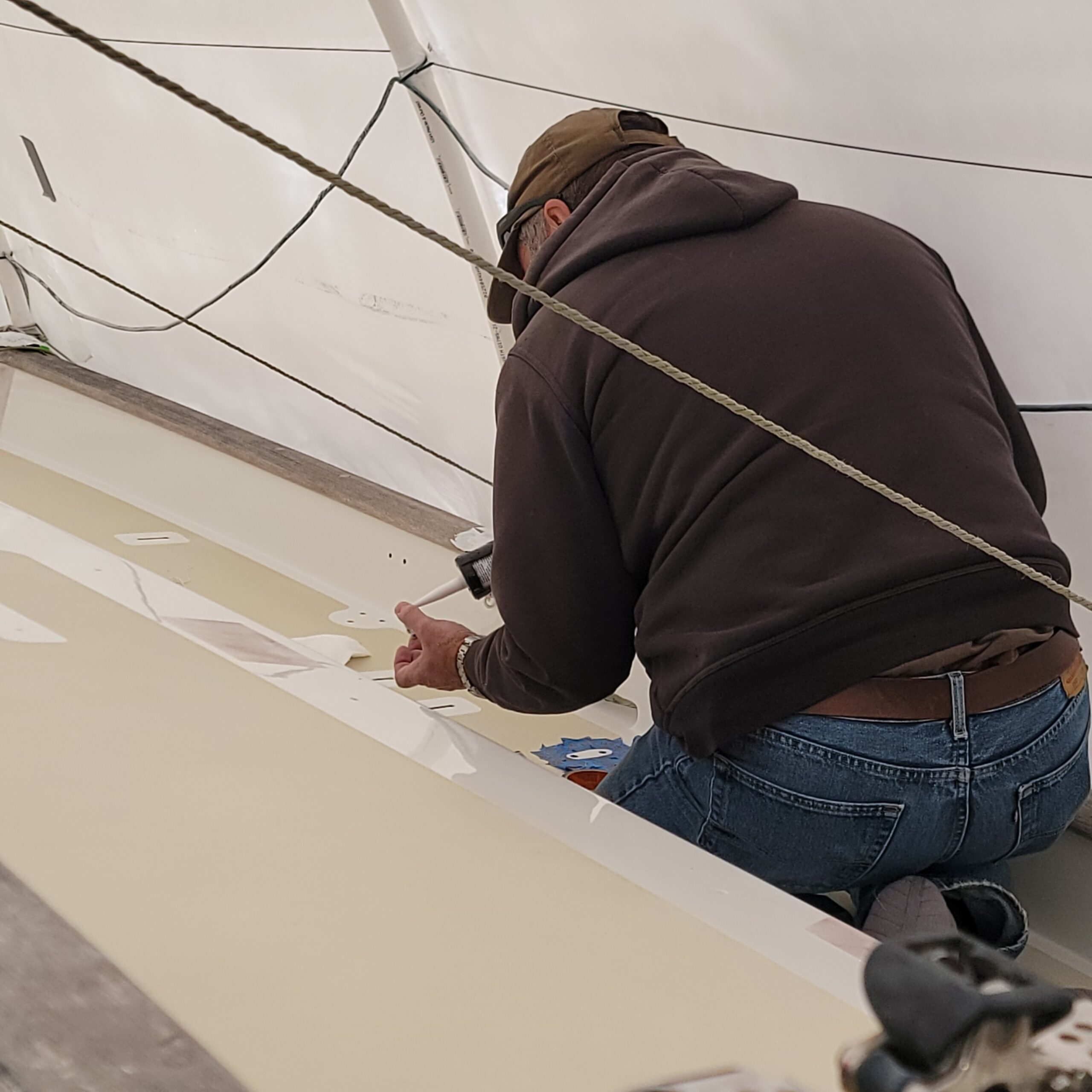 Once they finished the last coat on the deck level nonskid, there were two rounds of repairs. First they do all the touchups on the gelcoat. Then a final round of touchup is done after all the boat goes back into the water, where Rob and I get a lesson in how to make the repairs ourselves. They marked off all the spots that needed touchups.