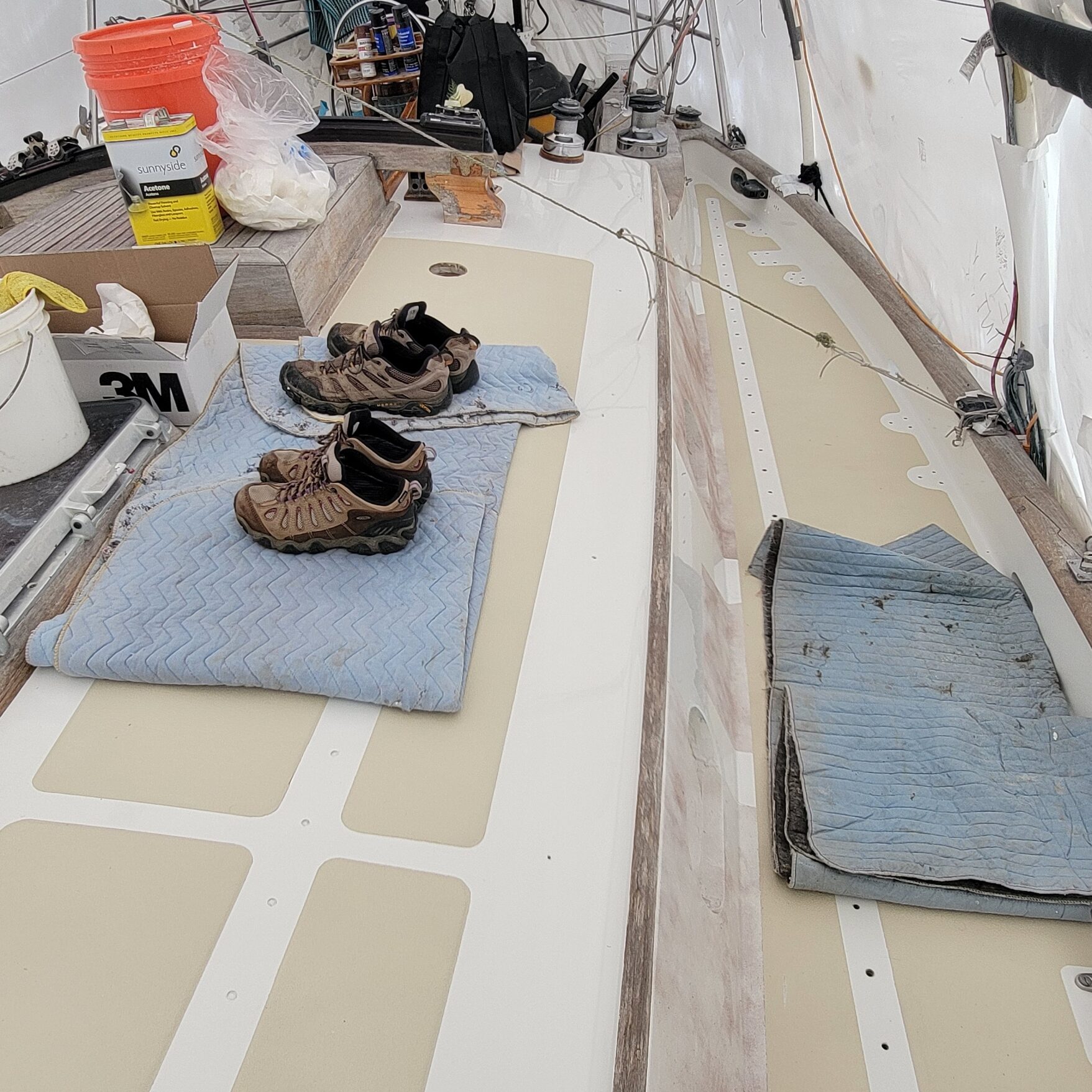 I don’t know what week it is, and honestly don’t care. The decks are done! And not only done, but beautifully done. I told myself when this project started that I would have to work on convincing myself it was OK to not have those beautiful teak decks. But now, seeing what we have, more importantly knowing why, and having so much appreciation for all the hard work that went into this project, I could absolutely not be any happier.