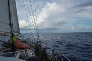 After setting the jib in the spinnaker pole yesterday we had a really nice ride. The rolling settled down and we chugged right along. When I reported in to the evening ham net we had 18 knots of wind and were averaging 6.1 knots in the direction we wanted to go. Nothing to complain about there at all. When Rob woke me for my 11:00 watch the wind had all but died. The sails were just filling and dropping as the swells rolled under us. With the jib out on a pole it wasn’t too noisy, and we were managing about 3 knots. I think Rob reported 11 miles made good on his 2-5 am watch. The forecast is for the winds to continue light through today and nearly die tomorrow.