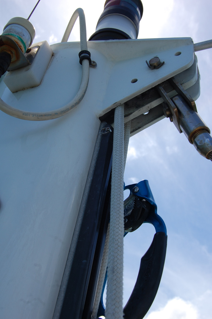 When we arrived at Majuro in November we noticed that our main halyard had two major chafe spots in it – one where it came…